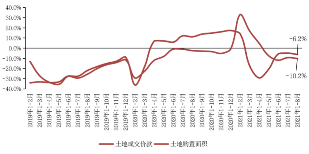 1-8月,房地产开发企业土地购置面积10733万平方米,同比下降10.2%;土地成交价款6647亿元,下降6.2%;二者较1-7月降幅分别扩大0.9和1.4个百分点。8月受到多城二轮集中供地规则调整,一二线城市土拍量价均延续低位运行。同时受土地侧调控进一步深入影响,热点三四线城市8月土拍降温明显,如嘉兴最近一轮土拍过半数地块未达熔断阶段即成交,3宗宅地更是底价成交。