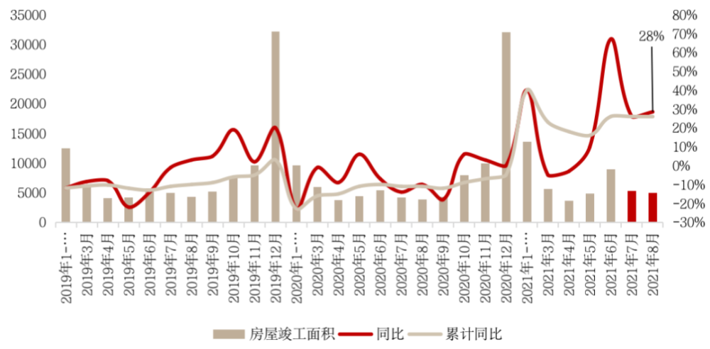 8月全国房企房屋竣工面积4957万平方米,同比增速和累计同比增速双双增长至26%和28%。一方面“交付大年”下房企具备刚性压力,另一方面提速已售项目竣工可盘活预售资金监管账户内资金。因此房屋竣工面积持续发力,支撑8月整体投资规模环比小增。