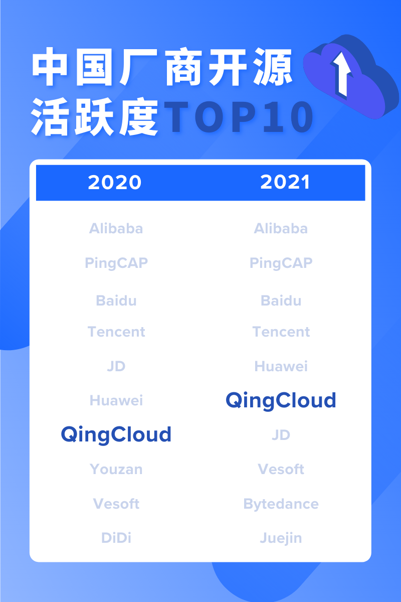日前,《中国开源十年洞察报告》重磅发布,中国厂商开源活跃度TOP 10榜单公布,青云科技再度上榜,排名也从去年的第7位提升至今年的第6位,其在开源项目打造、开源社区搭建与运营、与开源基金会及开源社区的合作等方面所作出的贡献与成就得到了业界高度认可。